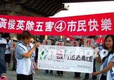 高雄市長選舉進入倒計時,十二月五日一支游行隊伍在橫幅上打出訴求口號。中新社 攝