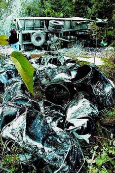前天1時50分,一輛車牌號為桂GA1416的解放牌平頭大貨車在金秀瑤族自治縣七建鄉(xiāng)至三角鄉(xiāng)途中翻下約60米高的山坡,滑下金秀河道。車上載著的100桶共20噸三氧化二砷(俗稱砒霜),有33桶跌入河道,其中30桶不同程度破損,少量砒霜散落河水中,其余67桶翻在山坡上。目前,此事已經(jīng)上報中央和國務院,中央政治局常委、國務院副總理吳邦國要求迅速妥善處理好此事。