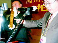 今天上午9點,距離正式開拍還有一個小時,設(shè)在成都人和賓館會議室里的拍賣現(xiàn)場已是人聲鼎沸,從全國各地趕來的多家媒體紛紛搶占有利地形,而“競拍席”上的買家則在最后時刻才神秘亮相。此前記者獲知,組織此次拍賣的四川金通拍賣行一直對參與競拍的三家企業(yè)避而不談,只透露其中有著名電器銷售公司成都國美電器,而另兩家則是四川本省的企業(yè),但是在競拍現(xiàn)場記者注意到,只有代表成都國美電器的28號競買者比較活躍,而另外兩家企業(yè)的競買人卻出人意料地沒有舉牌參加競買,結(jié)果,在開場20分鐘后兩塊金錠就毫無懸念的以底價62萬元被拍出。