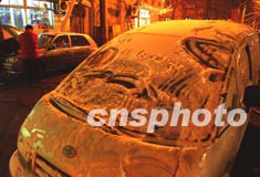 北京城十二月中旬連降瑞雪,頑童雪夜利用路邊轎車上的積雪,大玩涂鴉藝術(shù)。作者:賈國榮