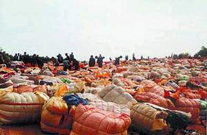 連日來,陸豐、碣石等三級黨委、政府針對陸豐碣石鎮(zhèn)瘋狂走私洋垃圾衫一事,積極組織包括海關(guān)、邊防、公安、工商等專項隊伍,出動1000余人次,對陸豐碣石鎮(zhèn)的所有市場、村莊等采取逐家清查的地毯式清理。到昨天為止,共查獲洋垃圾衫達(dá)1200捆、近100噸。