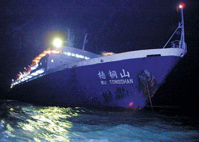 經(jīng)過近40分鐘的航行后,記者終于看到漆黑海面上燈火通明的“梧桐山”輪?瓷先ィ拔嗤┥健陛喆w已有些傾斜,但在夜幕中看不到火光和濃煙。