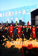 新世紀中國第一個大工程——南水北調東線山東省段濟平干渠工程,二十七日于山東省濟南市長清區(qū)孝里鎮(zhèn)北貴平莊的山口起爆開工。中共山東省委書記、省長張高麗,國家發(fā)展計劃委員會副主任于廣洲,國家水利部副部長翟浩輝等為工程奠基。作者:王魯平