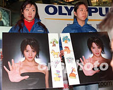 香港歌星梁詠琪今年在北京成為奧林巴斯商家代言人。二十九日,兩位北京小姐在翠微商廈手捧梁詠琪的兩幅細(xì)微差異肖像請顧客辨認(rèn),優(yōu)勝者可以獲獎。作者:鄒憲