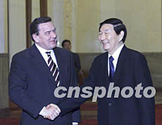 施羅德表示,德中兩國在各領域的關系很好,兩國關系有著牢固的基礎,保持了穩(wěn)定性和連續(xù)性。上海磁浮列車項目是兩國富有成效的經(jīng)濟技術合作的重要標志。德方希望德中關系繼續(xù)在高水平上向前發(fā)展,希望進一步加強與中方在旅游、文化、人員交流等各領域的合作,也期待著與中方加強在聯(lián)合國安理會內的磋商與合作。