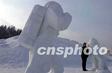 圖:雪雕宇航員歡迎“神舟”四號(hào)回家