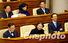 香港政務(wù)司長曾蔭權(quán)、財(cái)政司長梁錦松、律政司長梁愛詩等政府高官及立法會(huì)議員,1月8日出席立法會(huì),聽取行政長官董建華發(fā)表施政報(bào)告。洪少葵 攝