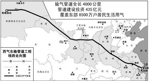 作為中國最長的管道工程和實施西部大開發(fā)戰(zhàn)略的標志性項目,西氣東輸管道工程于2002年7月4日開工。該管線的建成將使中國的天然氣產(chǎn)量增加50%,使天然氣占全國一次能源結構的比重由2.1%提高到3%。