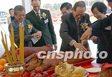 九廣鐵路公司落馬洲支線動(dòng)土儀式一月九日在香港落馬洲舉行,該支線全長(zhǎng)7.4公里,由上水站向西北伸延經(jīng)古洞、洲頭至落馬洲車(chē)站 。圖為眾官員在儀式上拜神。錢(qián)興強(qiáng) 攝