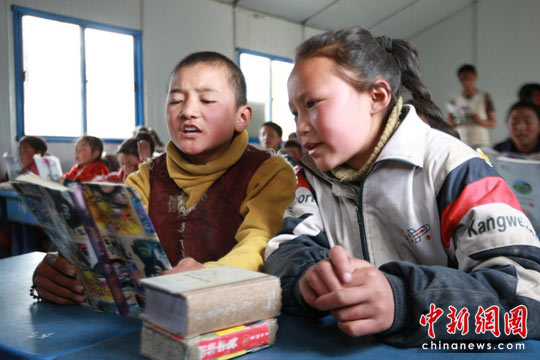青海玉樹地震:帳篷教室內(nèi)上課的孩子