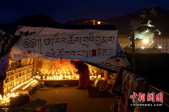 青海格薩爾王廣場點(diǎn)起酥油燈為逝者祈禱