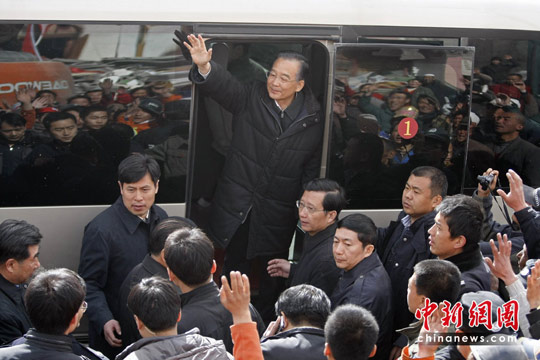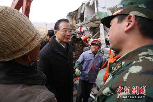 溫家寶玉樹災(zāi)區(qū)救援現(xiàn)場(chǎng)問候消防官兵