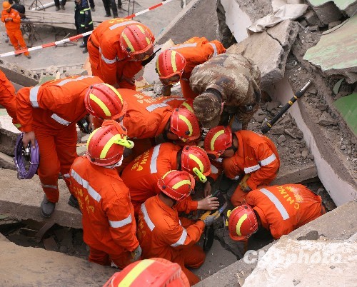 圖:西藏消防總隊(duì)在玉樹地震現(xiàn)場(chǎng)救援