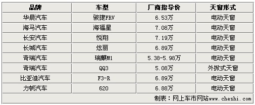 通過上面的表格我們可以看出,8款車型大部分配備了電動車窗,而價格也都在7萬元左右。除了價格最便宜的QQ僅配備了手動外掀式天窗外,其他車型都配備了電動車窗。對于7萬元左右這個價位,能夠擁有天窗,天氣晴朗的時候與大自然來個親密接觸,絕對是一種放松心情的不錯選擇。