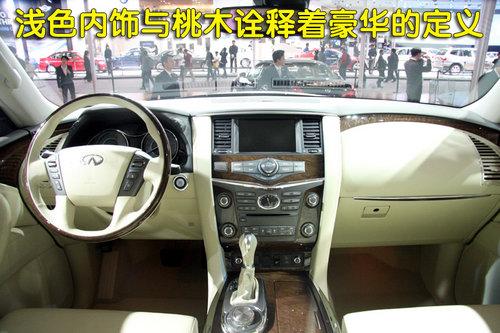 在來到英菲尼迪QX56內(nèi)室前,我就已經(jīng)想到了它會非常豪華,而眼前所看到的與先前的想法很一致。如果將內(nèi)室的圖片先行解析,我們很難想到這是一款SUV車型,而它更像是一款豪華轎車。內(nèi)飾全部由米色的真皮與桃木充斥著,溫暖與豪華也是QX56所想要的。白色的刻度、指針與藍(lán)色的裝飾背光組合的儀表盤,給略帶中庸的內(nèi)飾增添了一分時(shí)尚感。