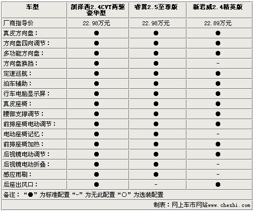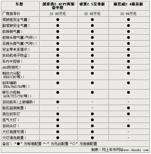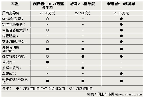 影音系統(tǒng)方面,三款車都為使用者提供了多揚(yáng)聲器的配置,除了AUX/USB接口外,凱澤西還配備了單碟CD,而睿翼則配備了更為便利的6碟CD系統(tǒng),新君威為單碟DVD。通過(guò)以上參數(shù)配置方面的比較,對(duì)于三款22.98萬(wàn)左右的中級(jí)車,配置方面基本打成平手,僅在一些細(xì)節(jié)方面有所出入,不過(guò)動(dòng)力方面凱澤西確是實(shí)實(shí)在在的戰(zhàn)勝了睿翼和新君威,幾乎將2.4L引擎的動(dòng)力發(fā)揮到了極致。