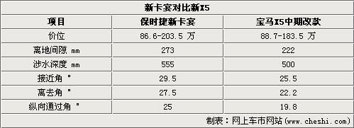 但是保時捷為卡宴標(biāo)配的空氣懸架系統(tǒng)因其能夠?qū)崿F(xiàn)車輛離地間隙的提升,因而在最大離地間隙、涉水深度以及接近角離去角的部分非常出色,相比BMW的X5來說這部分的優(yōu)勢在一些惡略路況下就會顯得非常明顯了。