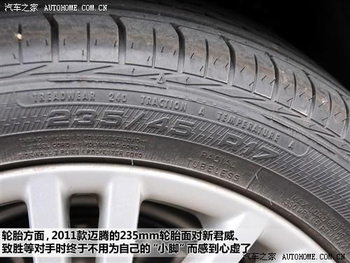 2011款邁騰有一項對性能影響很大的配置變化需要我們注意:2.0T的舒適型和豪華型換成了17寸的輪轂和235/45 R17的固特異單導(dǎo)向輪胎,相比之前215/55 R16的輪胎,直徑尺寸大了一個級別,寬度也增加了兩個級別,對性能的提升效果是非常明顯的,盡管有可能加速性能會稍差一些,但操控性和穩(wěn)定性會大幅攀升。