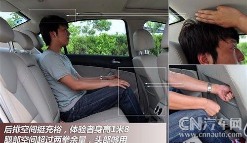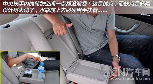 由于標(biāo)致408的軸距達(dá)到了2710mm,因此其后排擁有很寬松的乘坐空間。從上圖可以看到,體驗(yàn)者腿部前方將近兩拳半的活動(dòng)空間,可讓乘坐者任意擺出最舒適的姿勢(shì)。寬厚的后排座椅可為乘客提供舒適的駕乘感受,另外,在后排中央扶手箱內(nèi)還設(shè)置有一個(gè)內(nèi)藏式儲(chǔ)物格,可以放置一些體積不是很大的物品。