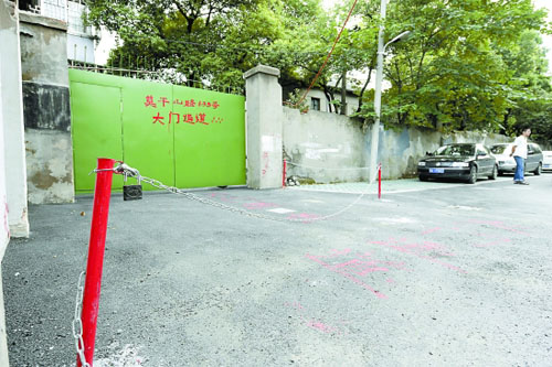 綠色的鐵門上,用紅色油漆赫然寫(xiě)著“莫干山路633號(hào)大門通道”,被圈的地面上寫(xiě)著“大門通道”幾個(gè)大字。