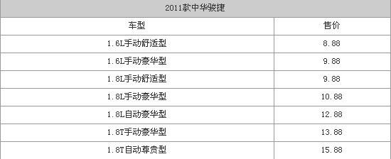 2010年7月8日,華晨中華正式推出了2011款駿捷車型,此次推出的新車共有7款不同配置的車型,分為1.6L、1.8L、1.8T三種動力調教。據(jù)悉,新車整體的售價區(qū)間為8.88-15.88萬元。