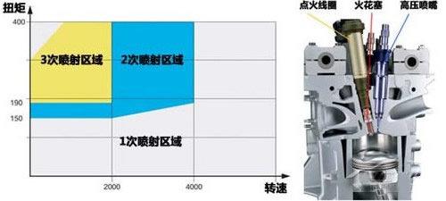 配合均質(zhì)燃燒模式的缸內(nèi)直噴技術(shù),在噴射邏輯上,根據(jù)不同的發(fā)動機(jī)工況采取不同的多次噴射技術(shù),即一個發(fā)動機(jī)點火循環(huán)中進(jìn)行多次噴射,更高效地形成混合氣。