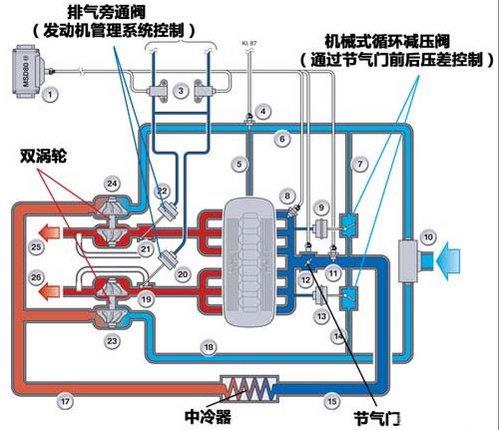 低轉(zhuǎn)速或者怠速的時候,排氣旁通閥完全關(guān)閉,所有的廢氣通過兩個輕質(zhì)小渦輪,獲得最大的增壓效果,提高低轉(zhuǎn)速下油門響應(yīng)性以及動力輸出;在發(fā)動機(jī)滿負(fù)荷的情況下,通過部分打開排氣旁通閥以獲得一個比較恒定的增壓壓力,不增加耗油量。