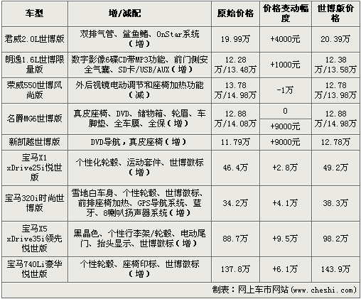不同品牌共推出9款世博版車型,范圍從自主到進(jìn)口,從緊湊級到頂級豪華車,體現(xiàn)出世博這一世界人類盛會的巨大影響力。車型全部采用增加或較少配置的做法進(jìn)行改款,最高價(jià)格漲幅達(dá)到了9.5萬,降價(jià)車型只有一款,降幅為1萬。