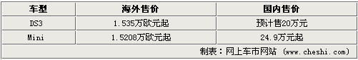 而在目前雪鐵龍DS系列車型僅有DS3一款,不出意外的話它將是長安-標(biāo)致雪鐵龍推出的首款車型,預(yù)計(jì)將在2012年投產(chǎn)。DS3是一款雙門運(yùn)動(dòng)型小車,競爭對(duì)手則是Mini,在歐洲地區(qū)的售價(jià)1.5萬歐元起。Mini在國內(nèi)的售價(jià)為24.9萬元起(海外售價(jià)同樣是1.5萬歐元起),考慮到DS3國產(chǎn)的原因,它的售價(jià)很可能會(huì)在20萬元左右,比Mini要便宜一些。而在國產(chǎn)前,這款車也在4月的北京車展上亮相過,看來是早有國產(chǎn)準(zhǔn)備。