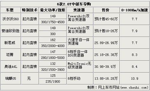 我們看到上述6款車中,有5款發(fā)動(dòng)機(jī)是采用缸內(nèi)直噴技術(shù),三款采用了雙離合變速器,只有來自自主的瑞麒G5要遜色很多,不過價(jià)格方面的優(yōu)勢(shì)是明顯的。在功率、扭矩方面,新君威優(yōu)勢(shì)明顯,體現(xiàn)在0-100Km/h加速上也是僅7.7秒,與年底上市的沃爾沃S60相當(dāng)。而蒙迪歐致勝考慮到沃爾沃與福特的關(guān)系,至少從參數(shù)上看與S60的2.0T發(fā)動(dòng)機(jī)很可能是同一款。