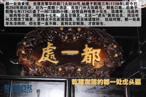 “都一處”名稱的來(lái)歷頗有幾分傳奇色彩,當(dāng)年乾隆皇帝從通州微服私訪回京途經(jīng)前門,當(dāng)時(shí)所有的店鋪都已關(guān)門,只有一家“王記酒鋪”亮燈營(yíng)業(yè),便進(jìn)店用膳,由于招待周到,酒味濃香,小菜可口,所以對(duì)小店產(chǎn)生了興趣,便和店主閑談起來(lái)詢問(wèn)酒店叫什么名,店主回答:“小店沒(méi)名”。乾隆聽(tīng)后說(shuō):此時(shí)京城開門的就你一家“就叫都一處吧!”乾隆回宮后親筆題寫了“都一處”店名,將其刻在匾上,幾天后宮中派人送來(lái)這塊虎頭匾。從此“都一處”代替了“王記酒鋪”,生意十分紅火。