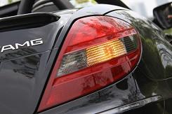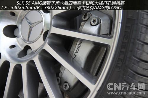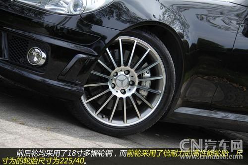 從輪轂以及剎車鉗都可以看到有AMG的標識,可以看出這些都是AMG為SLK55重新打造得。配置18吋多幅式鋁圈的SLK55AMD,配用的輪胎是前225/40、后245/35/18P-Zero紅飆。煞車因動力和車重均較小之故,只裝置了前六后四活塞卡鉗+大徑打孔通風碟(F:340×32mm/R:330×26mm),不過它的前碟中心盤采用了鋁合金的兩片式構造,對于減輕簧下負重與抑制熱衰退肯定有正面的作用。