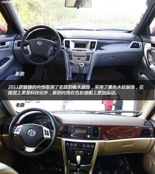 2011款駿捷的內飾取消了老款的桃木裝飾,采用了黑色木紋裝飾,在視覺上更顯科技化外,新的內飾在色彩搭配上更加運動。中控臺和老款車型差異很大,采用了大量的按鍵設計,中控鎖、后備箱開關、油箱開關集成在最上面。新款駿捷的三幅方向盤改成了四幅式設計,感覺更加穩(wěn)重。