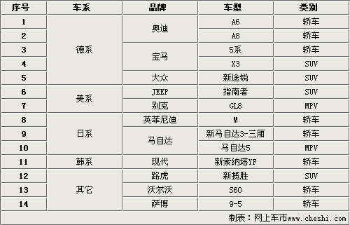 隨著中國汽車市場的逐漸成熟,越來越多的汽車廠商將重點(diǎn)放在了中國汽車市場。目前在中國汽車市場上熱銷的部分車型經(jīng)過幾年的洗禮,即將迎來它們的全新?lián)Q代產(chǎn)品,這些車型無疑將會使原本競爭激烈市場變得更加厲害,同時(shí)也豐富了消費(fèi)者對車型的選擇。我們細(xì)數(shù)了一下下半年上市的新車,從中發(fā)現(xiàn)了14款即將全新?lián)Q代的車型,其中不乏一些重量級產(chǎn)品,它們無論是從動力系統(tǒng)、舒適配置還是車身尺寸都得到了提升。譬如:奧迪的A8、A6;寶馬的全新5系和X3;路虎的全新攬勝;沃爾沃S60等等。具體車型見下表: