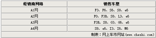 另據(jù)了解,比亞迪M6將在A4網(wǎng)中銷售,其他車型還包括I3、I6等未上市新車和e6新能源車,已上市的只有S8跑車。而A1、A2、A3網(wǎng)絡(luò)的新車推出規(guī)劃已經(jīng)接近完成,只有像S6、G6等少數(shù)車型未上市銷售。