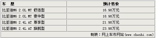 據(jù)比亞迪經(jīng)銷商處銷售人員介紹,M6將在20日正式上市,預(yù)熱宣傳活動已經(jīng)全面展開,將推出2.0L手動舒適型、豪華型和2.4L自動尊享型、旗艦型,預(yù)定價為16.98-23.98萬,前期預(yù)定該車的客戶可享受優(yōu)先提車、提車不加價等優(yōu)厚待遇。