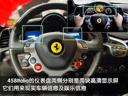 458Italia將儀表盤左右兩側(cè)設(shè)計(jì)了兩個(gè)高清晰的TFT顯示屏,在它們相應(yīng)的左右兩側(cè)儀表臺(tái)的位置上分別有調(diào)節(jié)按鈕去控制它們的顯示內(nèi)容,您可以選擇顯示車速、GPS信息、娛樂信息。特別的地方是通過這兩個(gè)顯示屏可以顯示車輛在運(yùn)行中引擎、剎車片、輪胎的溫度是否正常,是否這三個(gè)重要的部件出現(xiàn)了過熱,這也意味著駕駛者通過儀表就可以了解到車輛此時(shí)是否已經(jīng)達(dá)到駕駛極限。
