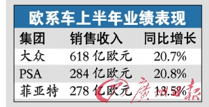 據(jù)統(tǒng)計,大眾汽車集團銷售收入升至618億歐元,同比增長20.7%。另一家歐洲汽車巨頭標致雪鐵龍也發(fā)布了半年業(yè)績,集團凈利潤為6.8億歐元,上半年營業(yè)額增長20.8%;日常營業(yè)利潤提高至11.37億歐元,而去年同期虧損 8.26億歐元。(劉俊)