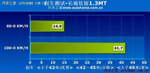 長城汽車的剎車一直得到較高的評(píng)價(jià),我們對(duì)1.3L車型進(jìn)行的剎車測試中,車輛全力剎車,車速從100-0KM/h的最短制動(dòng)距離為41.7米,系統(tǒng)的穩(wěn)定性處于中等水平,剎車成績還是不錯(cuò)的,我們比較滿意。