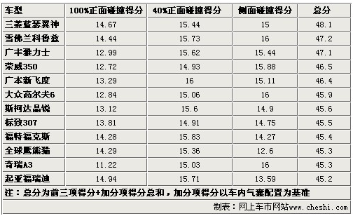 通過以上表格,我們可以看出這樣一個現(xiàn)象,12款車當中涉及自主品牌、日韓系列和德美系列各國車型。很多人一直堅信德美系的車要比其他兩類車要結實,但事實證明他們的成績也并非那么無懈可擊?磥鞢-NCAP的鐵證也可以做一回流言終結者了,不過這12款車全部達到了45分以上,也就是C=NCAP五星級安全標準。至于傳說中的五星半級別,在比較常見的國產(chǎn)車中只有雅閣和CR-V達到。