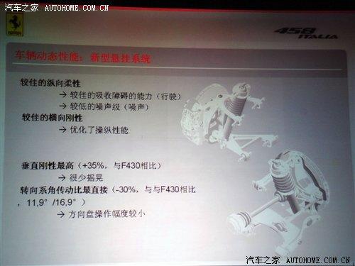 該車采用的新型底盤亦為鋁制,在底盤設(shè)計過程中,馬拉內(nèi)羅的工程師不僅運用了各類先進的合金材料,同時也從航空航天業(yè)借鑒了尖端的制造和焊接技術(shù)。在車輛動力方面,法拉利458 Italia的懸掛系統(tǒng)在前部配備了雙叉骨,而后部則采用了多鏈系統(tǒng),借以提供最大的附著力和無與倫比的操控性能。該車的轉(zhuǎn)向傳動比更加快捷高效,在實現(xiàn)極速入彎的同時也能保證超凡的駕駛舒適度。