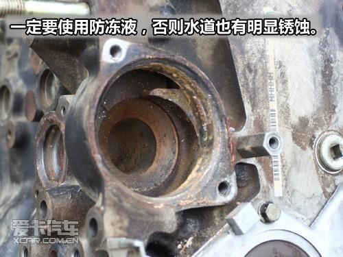 長期使用水而不使用防凍液會(huì)腐蝕水泵葉輪,尤其是金屬葉輪腐蝕最為嚴(yán)重。此外,水箱也會(huì)被水垢腐蝕造成管路堵塞,圖上這個(gè)腐蝕的情況是一般情況,更為嚴(yán)重的是葉輪已經(jīng)徹底被腐蝕掉,散熱系統(tǒng)降低造成水溫過高而經(jīng)常開鍋。