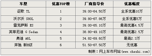 要說(shuō)寶馬全新一代5系LI車型的上市撼動(dòng)整個(gè)中級(jí)車市場(chǎng),這樣的說(shuō)法絕對(duì)不算嚴(yán)重。同級(jí)別車型都沒(méi)閑著,紛紛打出降價(jià)牌。排行榜中高居榜首的是本田的高端品牌謳歌TL車型,以全系優(yōu)惠10萬(wàn)元的巨大幅度拔得頭籌;中間分列二三四五位的是沃爾沃S80L:全系優(yōu)惠5萬(wàn)、雷克薩斯ES:最高優(yōu)惠4.5萬(wàn)、英菲尼迪G系列:最高優(yōu)惠2.5萬(wàn)、奧迪A6L最高優(yōu)惠2.3萬(wàn)。唯一一款沒(méi)有降價(jià)的車型是奔馳剛剛上市才不久的國(guó)產(chǎn)新E級(jí),全系沒(méi)有優(yōu)惠政策,購(gòu)車需預(yù)定。