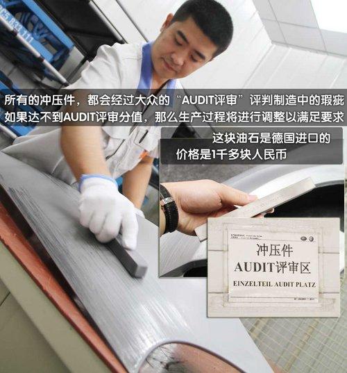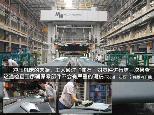 在生產(chǎn)線的中間是工作人員的監(jiān)控區(qū)域,工作人員可以通過監(jiān)視器看到整個沖壓車間的的生產(chǎn)狀況。而在每一個沖壓機床的末端,工人會對每一個沖壓出來的配件進行粗檢。然后由一汽大眾的AUDIT評審專家,對配件進行“比客戶更加苛刻”的標準,去檢查配件的公益標準。