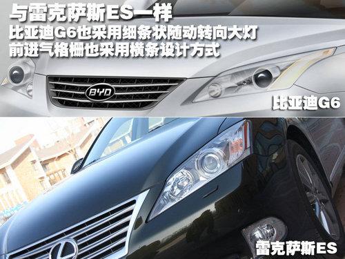 比亞迪G6的前臉是與雷克薩斯ES最為相似的地方,從圖片中可以看到,比亞迪G6的前臉進(jìn)氣格柵采用橫條貫穿,設(shè)計(jì)方式與雷克薩斯ES一模一樣。所不同的是,雷克薩斯ES的進(jìn)氣格柵采用質(zhì)感十足的四個(gè)鍍鉻條,而比亞迪G6只采用3個(gè)裝飾條,顯得有幾分單薄。