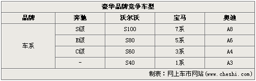 在國(guó)內(nèi)沃爾沃產(chǎn)品一直以高對(duì)手半級(jí)的定位競(jìng)爭(zhēng),S40因此成了寶馬3系、奧迪A4的競(jìng)品,而實(shí)際上S60才是它們的對(duì)手,將于年底引入國(guó)內(nèi)銷(xiāo)售,此時(shí)S40與S60雙重攻勢(shì)下,相信在入門(mén)級(jí)豪華車(chē)市場(chǎng)能夠取得更好的成績(jī)。而S80L的競(jìng)爭(zhēng)對(duì)手則是寶馬5系、奔馳E以及奧迪A6L,這樣的格局下S100則是沃爾沃急需補(bǔ)充的高端豪華車(chē),以便能在需求旺盛的高端市場(chǎng)占有一席之地。以沃爾沃轎車(chē)的命名規(guī)則來(lái)看,S40、S60、S80的延續(xù)則是S100。