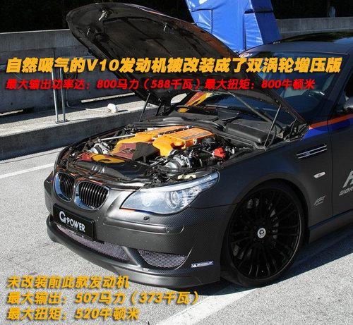 G – Power打造的這款M5是以老款的M5為基礎,在本已經非常強大的V10發(fā)動機倉中加裝了兩個渦輪增壓器,通過一系列的電腦以及油路等相關調校,讓老款的M5的動力性甚至超過了V12發(fā)動機。超過370km/h的最高時速比拼F1賽車。
