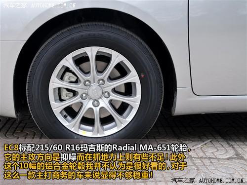 作為一款中型豪華車型,帝豪EC8必須使用鋁合金輪轂,不過圖中的這個(gè)10條幅樣式我個(gè)人不認(rèn)為很好看,或者說是顯得不夠穩(wěn)重。此外,為了配合中型車應(yīng)該有的靜謐性,在輪胎上使用了瑪吉斯產(chǎn)的MA-651型靜音輪胎,同樣由于這個(gè)輪胎是偏向于抑制輪噪,因此在抓地力上有些不足,不過對于一款注重乘坐感的車來說,太強(qiáng)的抓地力不是重要的。