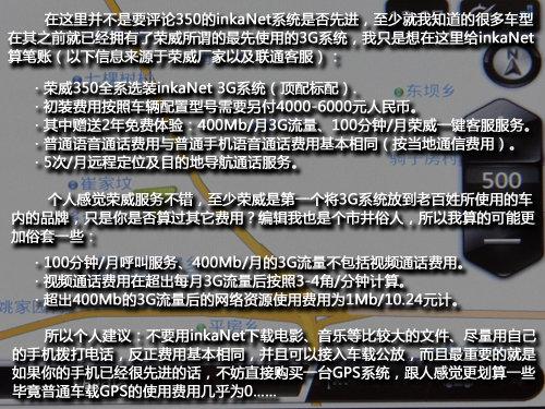 不同于那些高端品牌的汽車的3G系統(tǒng),350提供了更多的3G服務(wù),比如語音/視頻通話、影音服務(wù)、GPS定位等等各種服務(wù),當(dāng)然可能因?yàn)楣P者僅僅是個(gè)市井小生,所以對(duì)于350的3G系統(tǒng)的費(fèi)用,我一直持保留意見,畢竟贈(zèng)送100分鐘的通話時(shí)長(zhǎng)聽上去不錯(cuò),但它僅僅支持與榮威客服的通話,這點(diǎn)讓我感覺這免費(fèi)通話時(shí)長(zhǎng)跟沒有沒太大區(qū)別。