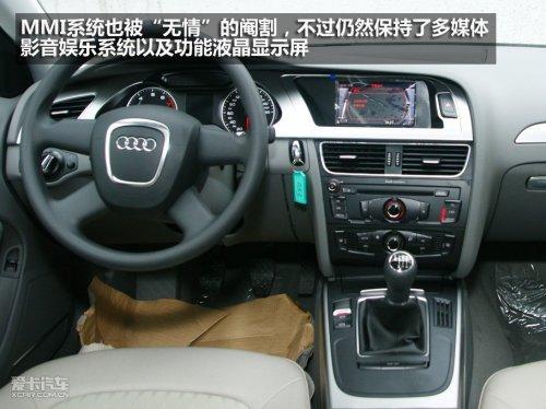 MMI多媒體影音導(dǎo)航系統(tǒng)也被閹割,排擋桿后面空空的塑料飾板顯得有一點(diǎn)點(diǎn)刺眼。不過音響系統(tǒng)與更高版本相比并無變化,而自動空調(diào)則取消了雙溫區(qū)劃分功能。不過無論是面板材質(zhì)還是整體制造工藝,完全保留了奧迪嚴(yán)謹(jǐn)豪華的風(fēng)格,質(zhì)感強(qiáng)烈的同時裝配嚴(yán)絲合縫,旋鈕的阻尼力度也十分適中。
